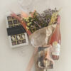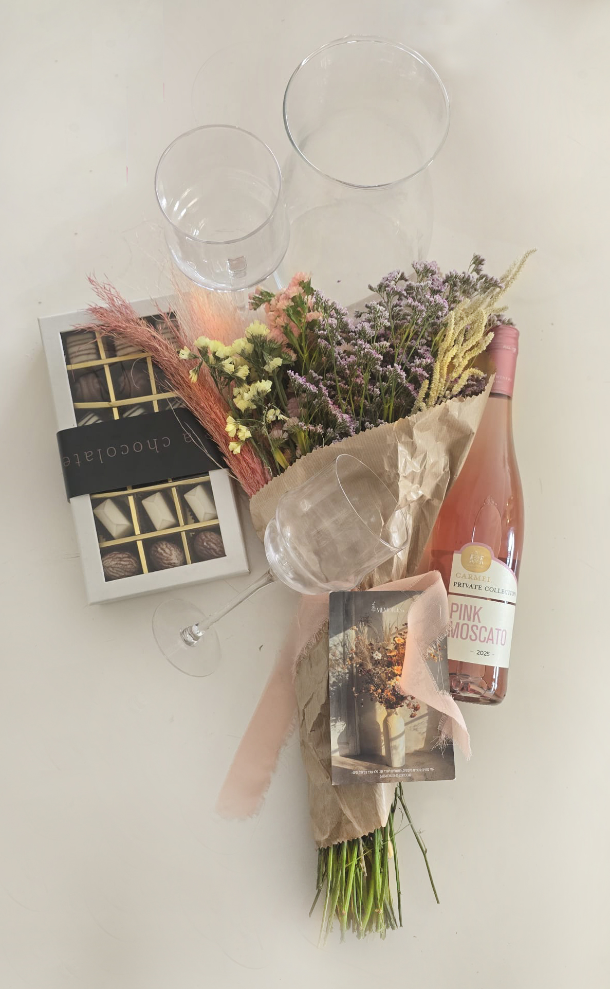 מארז יוקרתי וומיוחד הכולל זר פרחים בוטיק קסום ומיובש,יין רוזה (כשרות רובין) מארז פרלין בלגי יוקרתי חלבי, 2 כוסות וינטג' ליין , ואזה זכוכית